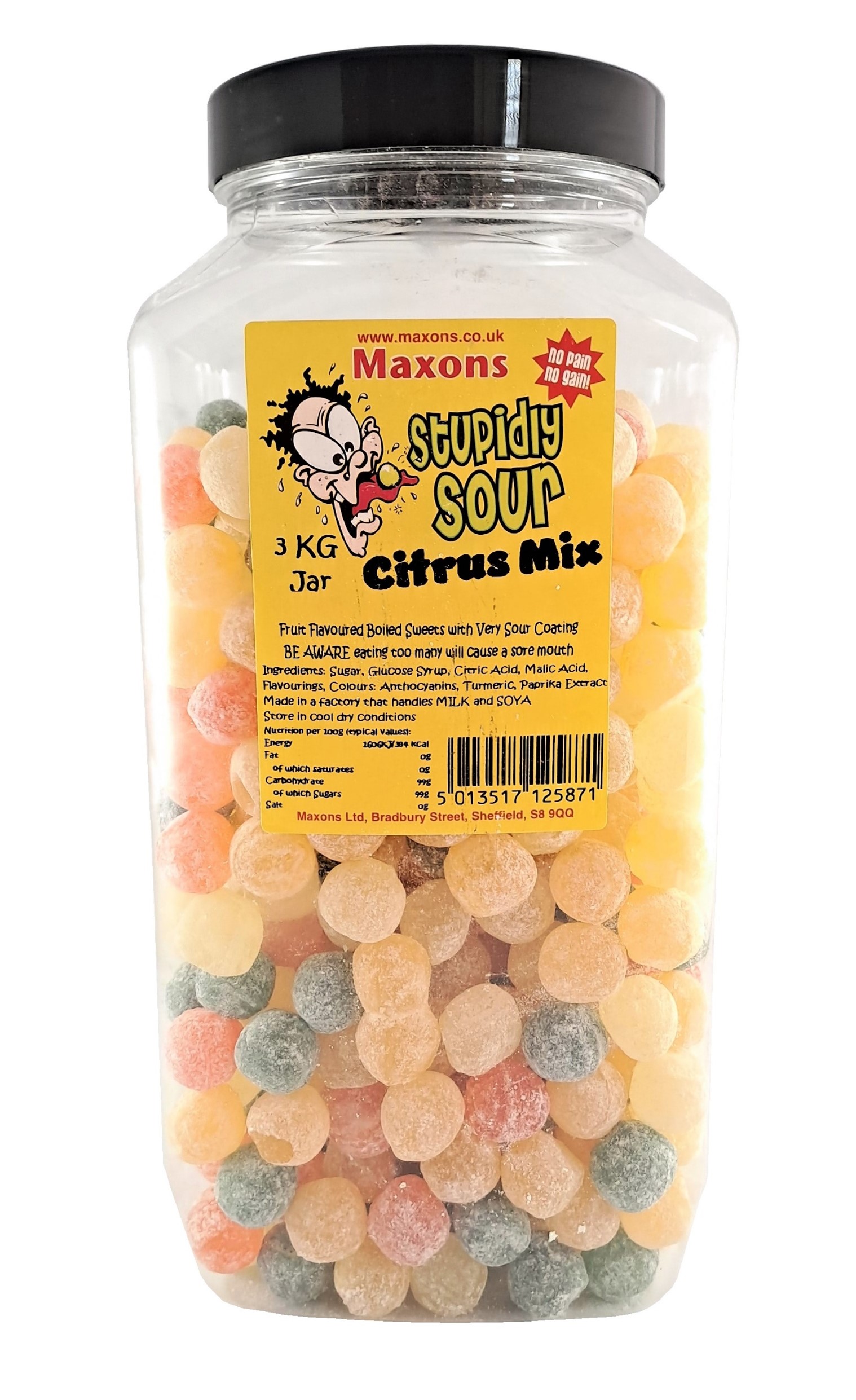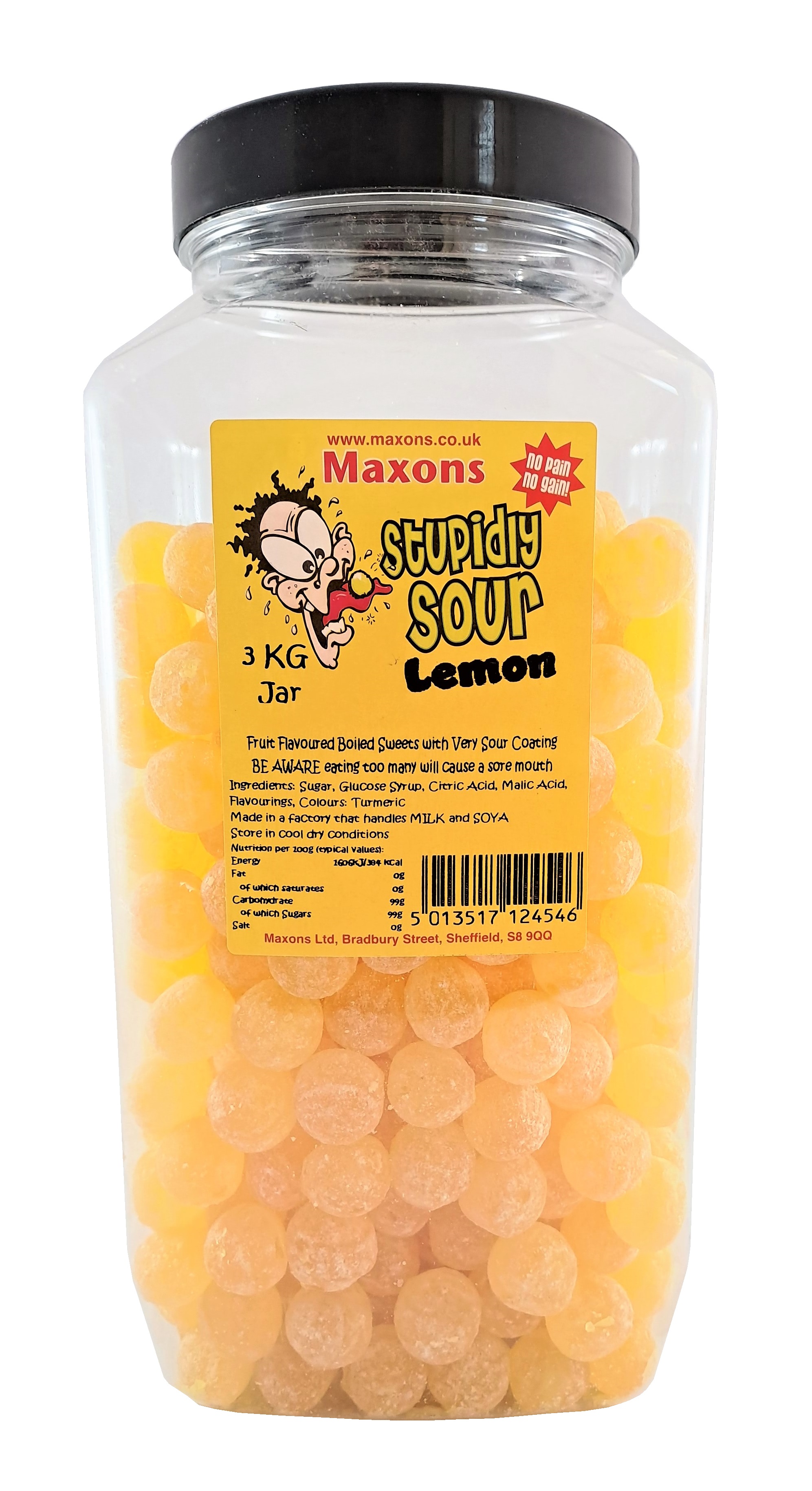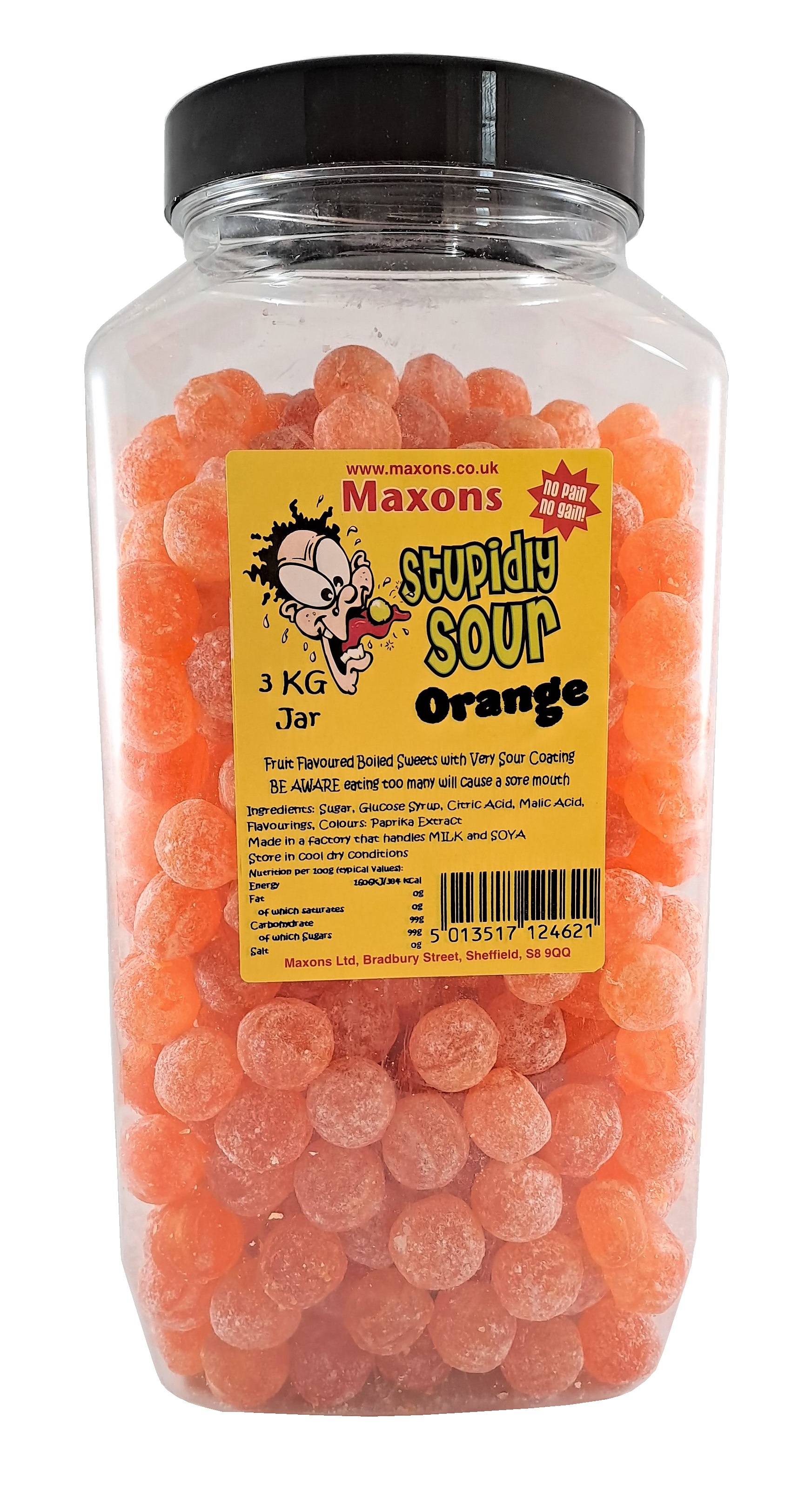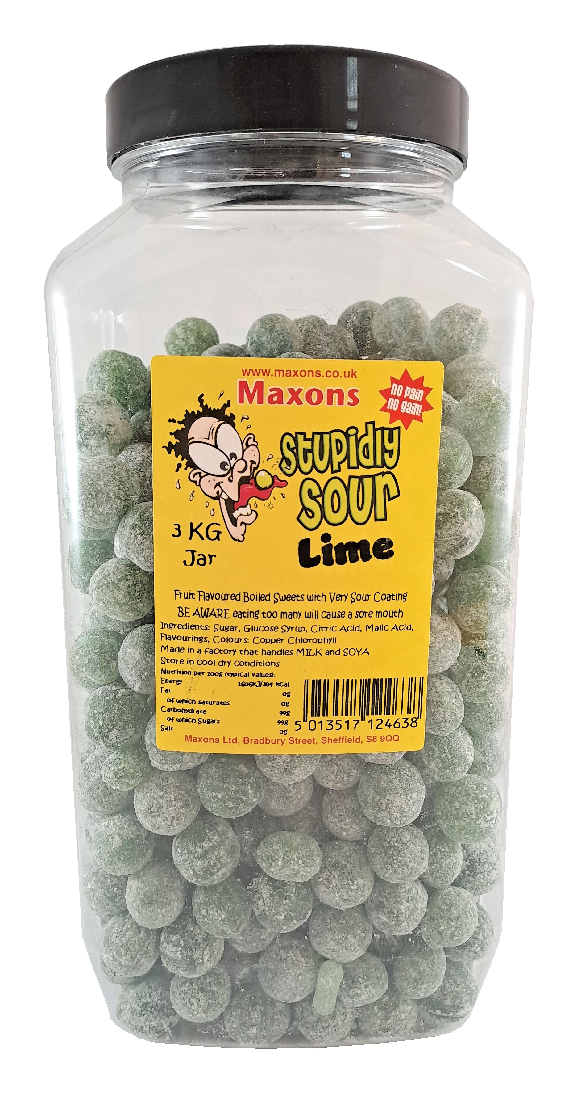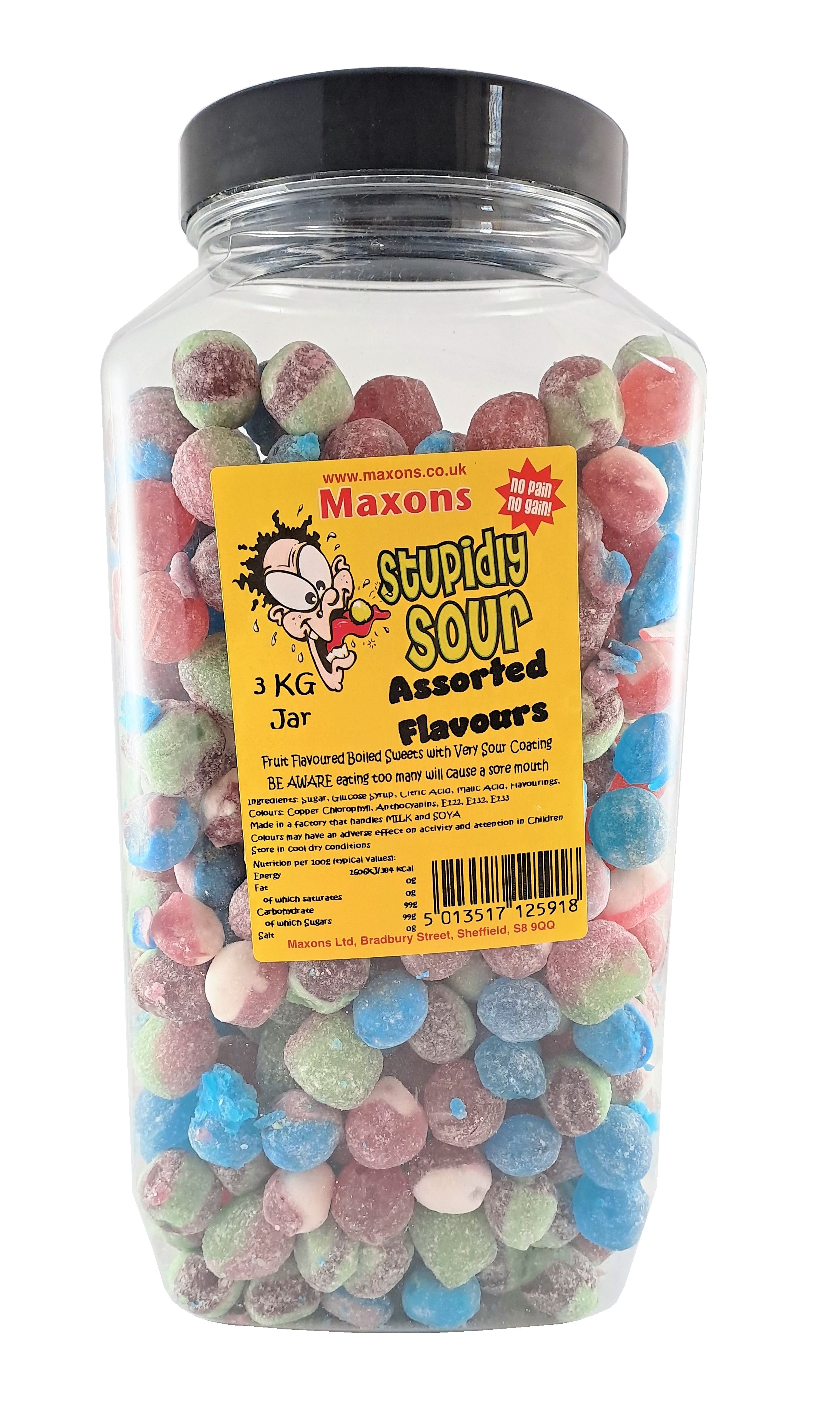 All the Stupidly Sour family of products packed in 3kg old fashioned sweet shop jars