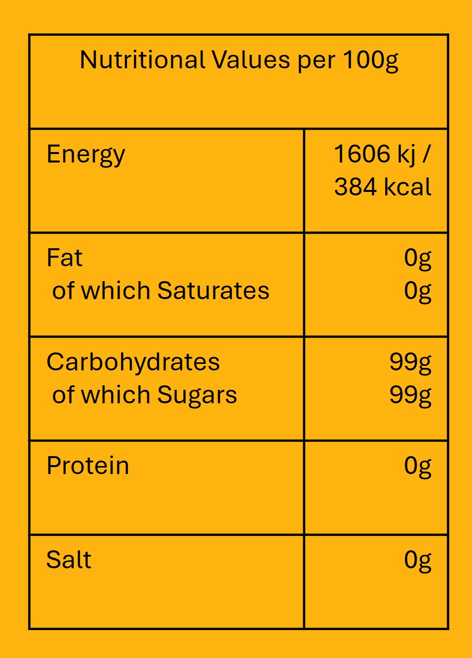 Ingredients: Sugar, glucose syrup, malic acid, citric acid, flavouring, Colours: Turmeric